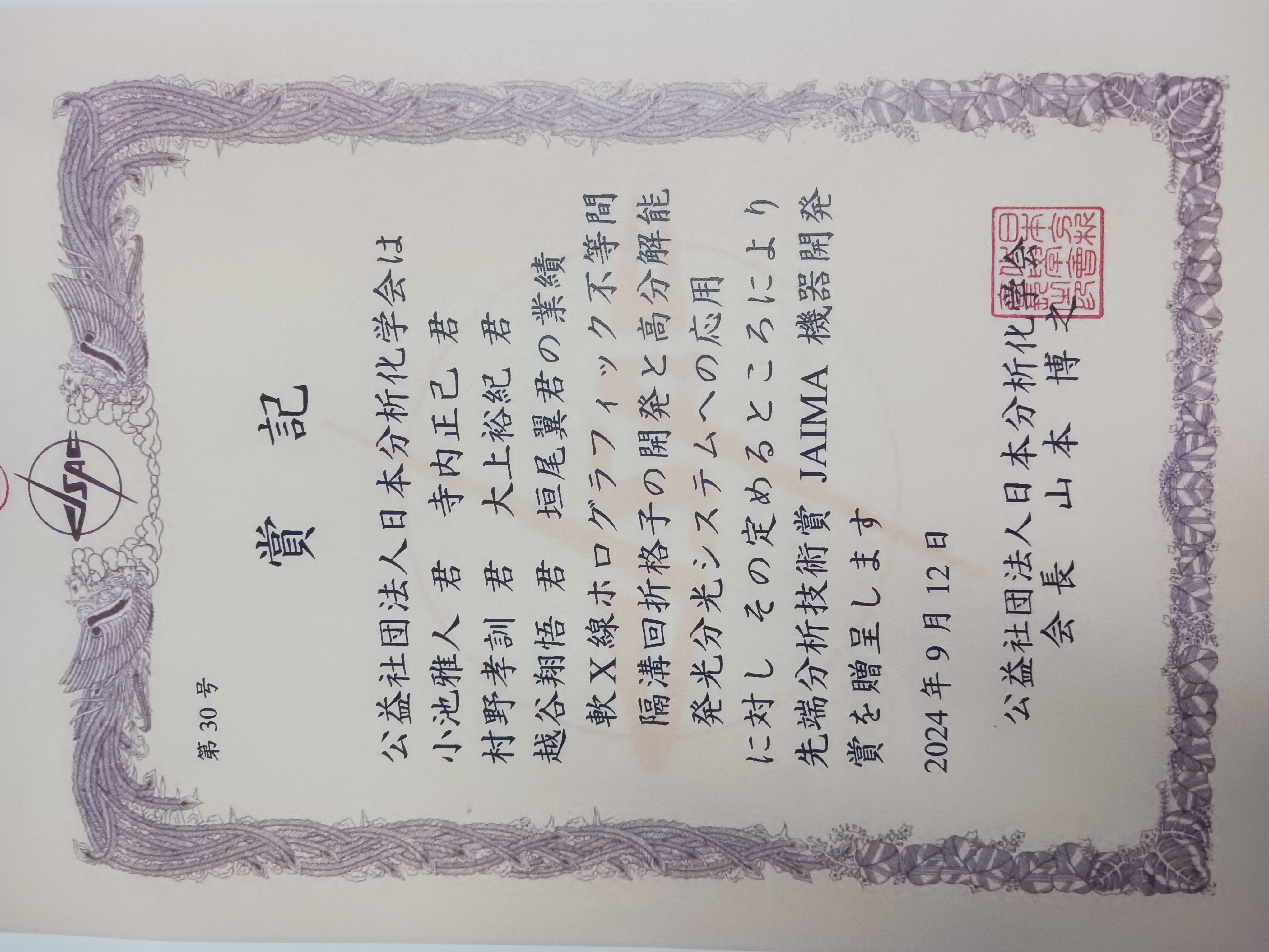 祝 寺内 正己教授が、先端分析技術賞(JAIM機器開発賞)を受賞しました。