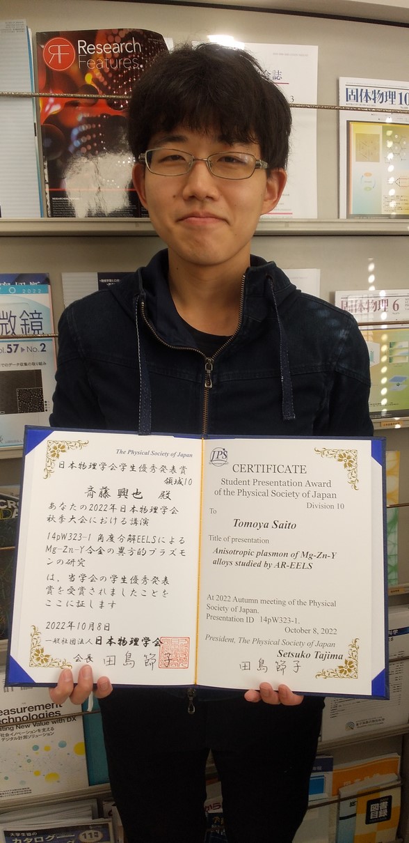 2022/10 :祝斎藤興也君(D1)が、日本物理学会2022年秋季大会にて、学生優秀発表賞を受賞しました。