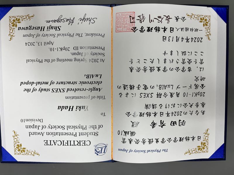 2024/4 :祝 羽田 有希君(M2)が、日本物理学会2024年春季大会にて、学生優秀発表賞を受賞しました。