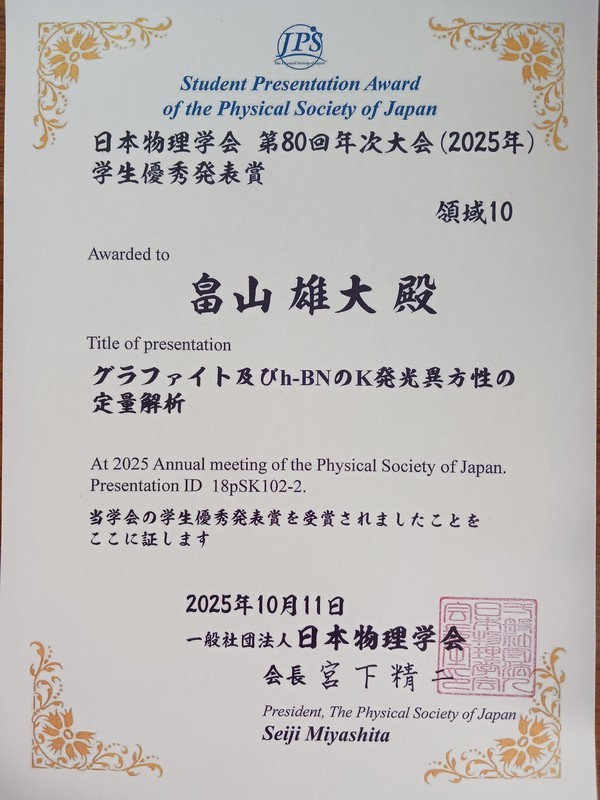 2025/10 :祝 畠山 雄大君(M2)が、日本物理学会 第80回年次大会(2025年)にて、