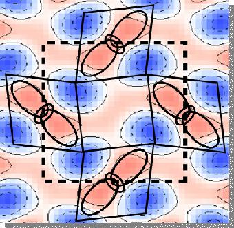 の軌道秩序相の電子密度分布を解析しています。Mn原子3d電子軌道の異方的秩