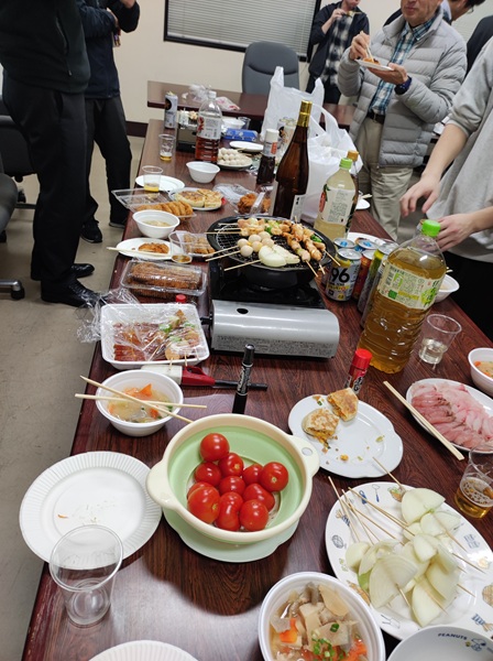 年々早く咲く桜。 建物の皆さんとお花見の機会がありました。 新しく入られた清水さんと木村君の歓迎もかねて、つどいました。 公衆電話、まだあるよ! ものすごい暴風のため、急遽室内で開催。 お刺身は、安達先生が調達。きれいに骨をとって板前さんのようにカット。 豚汁、揚げ物、李さんのおやき、大塚屋と佐々木屋の焼き鳥やさんも開店。 トマト、うずらの卵、浦霞も。最高ですね。 翌日、晴れたのでみんなで記念写真。 今年から入られた皆さん、どうぞよろしくお願いします。 🙂
