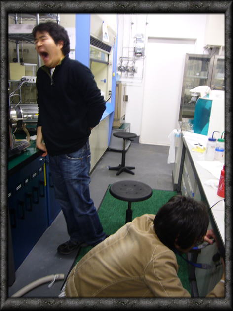 固相合成している岩井君(左)