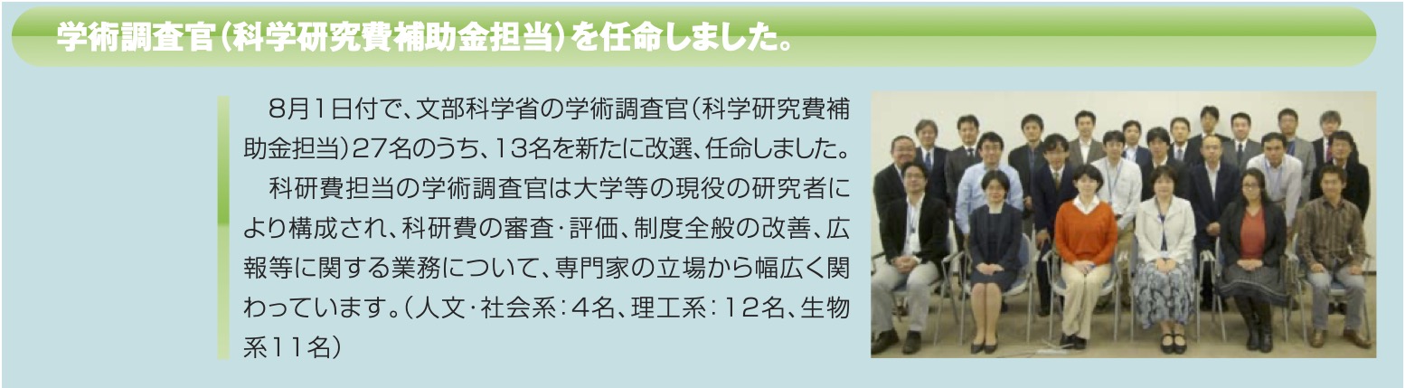 2013年8月から2015年7月までの2年間、文部科学省研究振興局学術調査官を担当しました(リンクは2014年8月着任メンバー)。