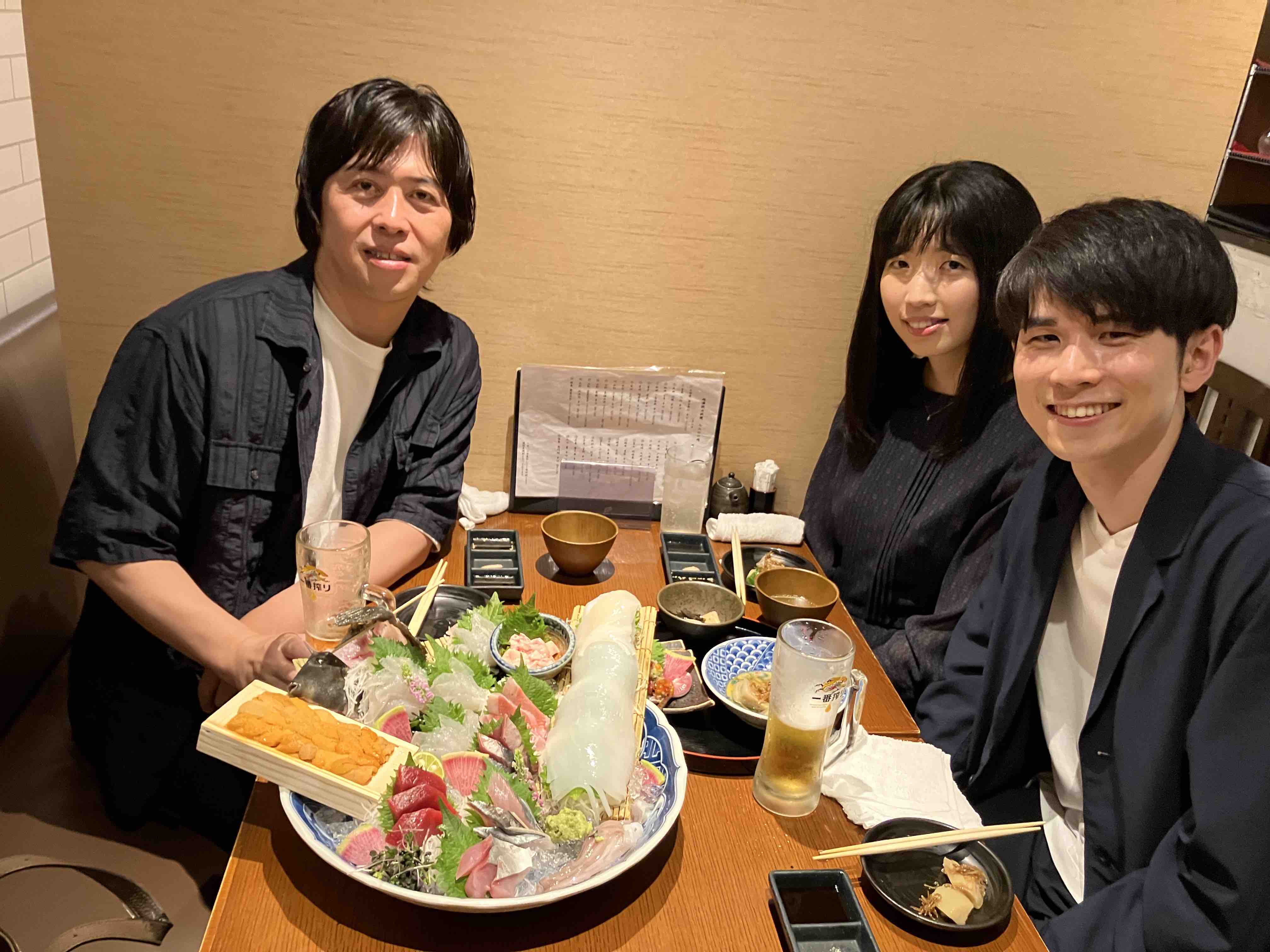 6月24日に11期生の片岡さんと10期生の橋本さんが訪問されました!(良い話でした!) 写真は「魚がし どまん中 神楽坂店」でのお祝い会の様子