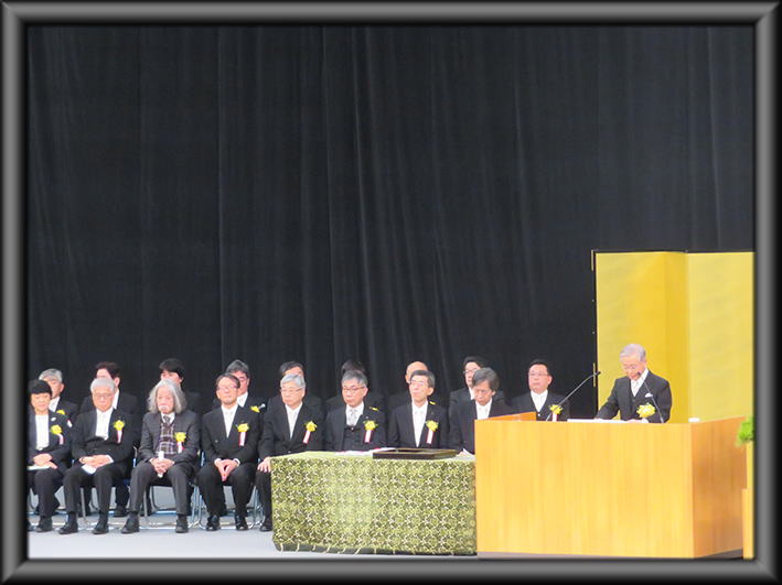 今年も根岸は総合化学研究科研究科長として参列しました!(秋山仁特任副学長の後ろ) 秋山特任副学長の左は高柳特任副学長(総合研究院長)で、その左が向井千秋特任副学長