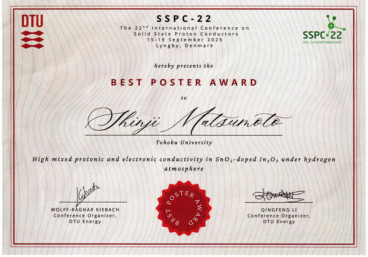 2025年09月19日、The 22st International Conference on Solid-State Protonic Conductors (SSPC-22) において、小俣研究室の松本真志さん(M1)が “Best poster award” を受賞しました。