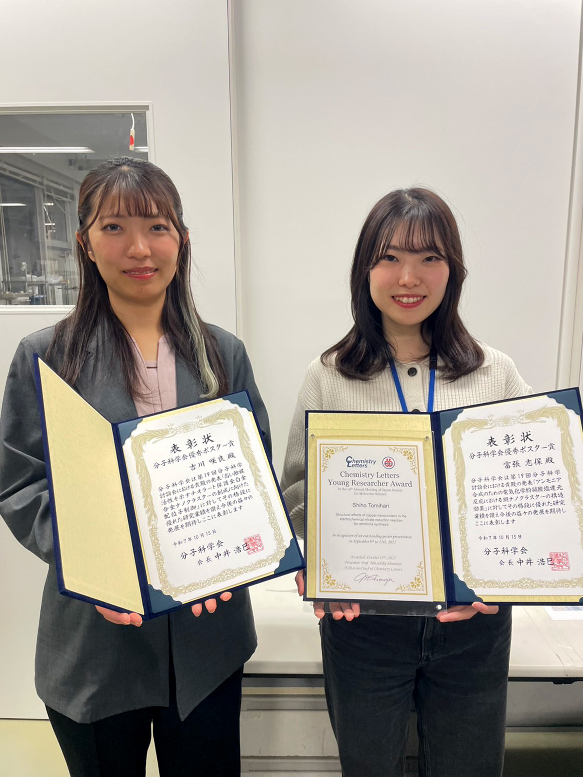 根岸研究室の富張志保さん(M2)が第19回分子科学討論会にて「Chemistry Letters Young Researcher Award」と「優秀ポスター賞」を、吉川咲良さん(M2)が「優秀ポスター賞」を受賞
