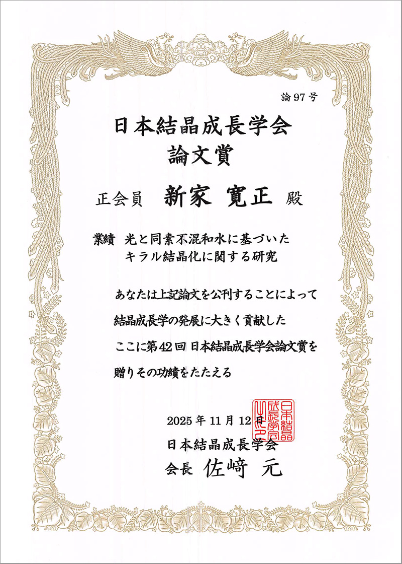 2025年11月12日、中川研究室の新家寛正助教が、日本結晶成長学会「第42回論文賞」を受賞しました。