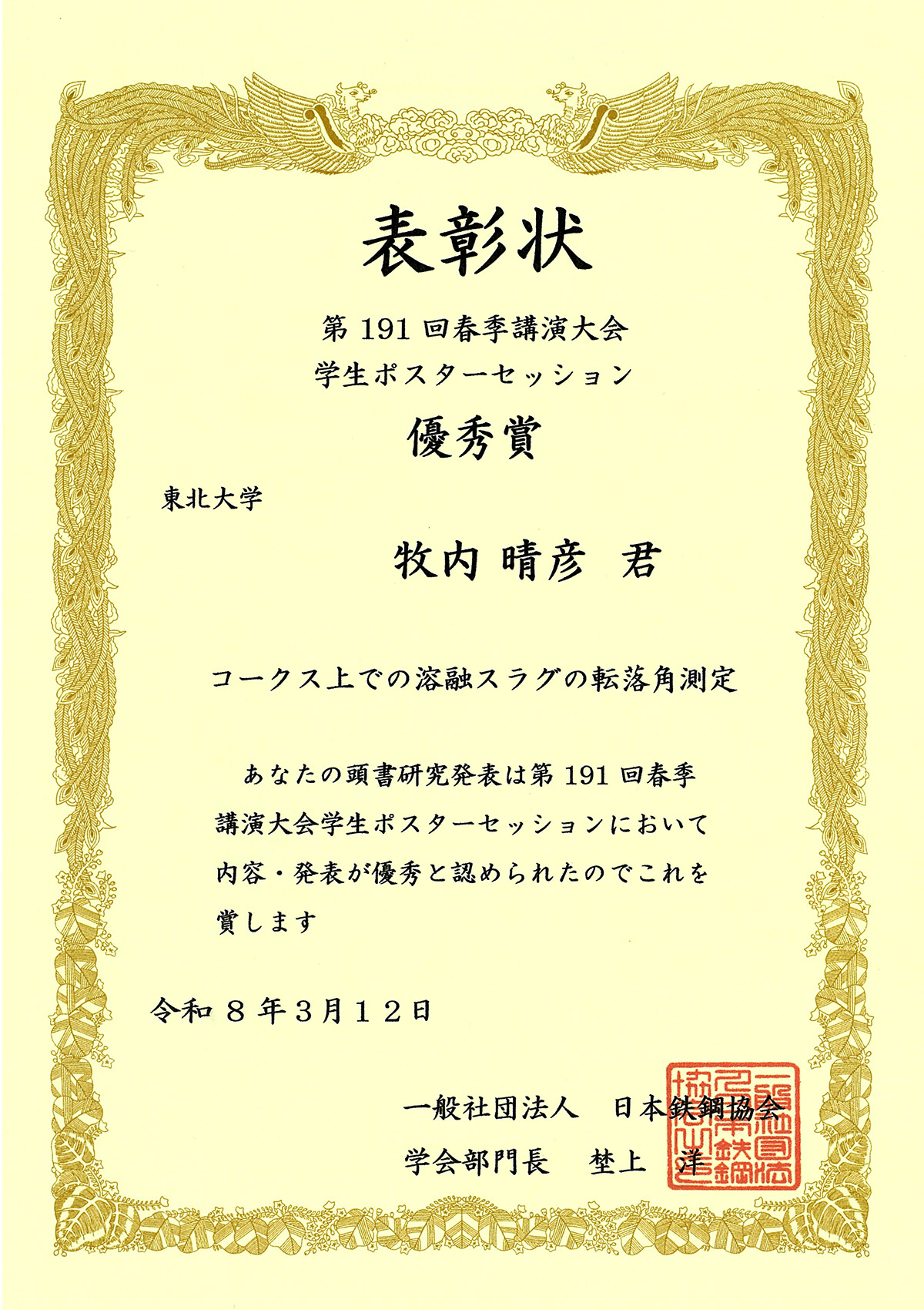2026年03月12日、日本鉄鋼協会第191回春季講演大会学生ポスターセッションにおいて、牧内晴彦さん(M1)が「優秀賞」を受賞しました。