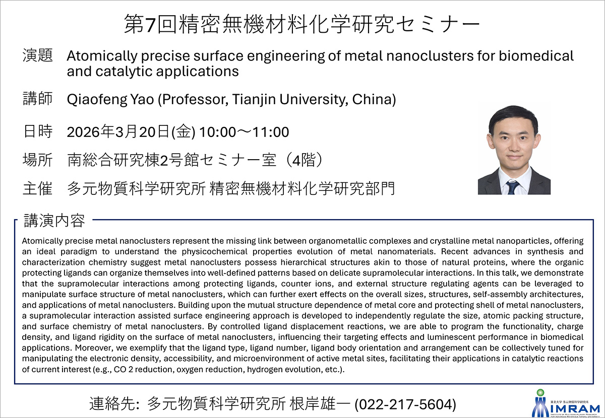 演題:Atomically precise surface engineering of metal nanoclusters for biomedical and catalytic applications