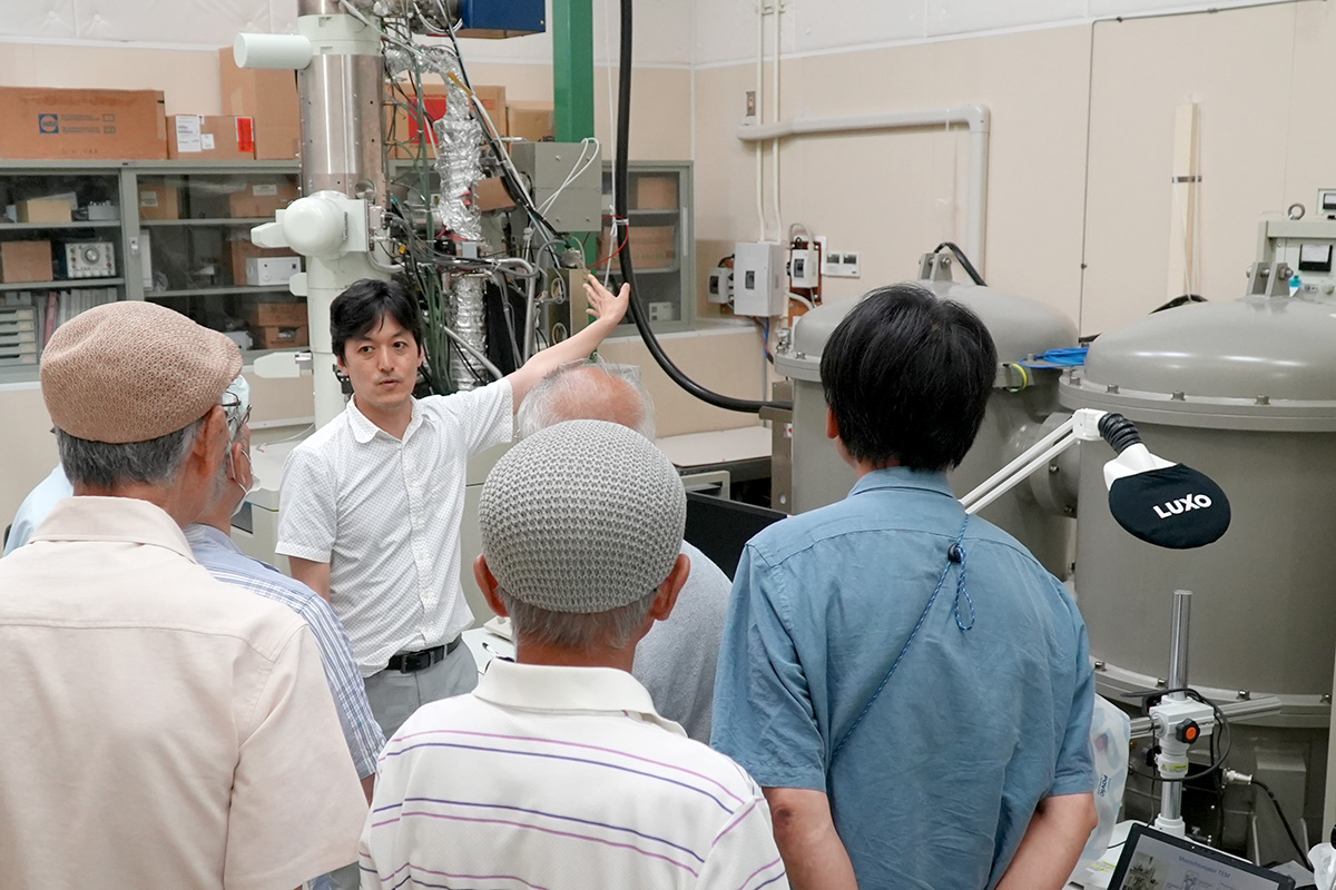 7月11日(金)の第2回講座では、電子回折・分光計測研究分野の寺内正己教授が「電子顕微鏡と物質科学」と題して講演し、22名が受講しました。さまざまな電子顕微鏡の仕組みや特徴と、その開発と社会実装の歴史を分かりやすく紹介しました。講座の後半には、実験室見学を行い、最先端のクライオ電子顕微鏡などさまざまな電子顕微鏡を実際に見ながら、計測の方法や特徴について解説しました。