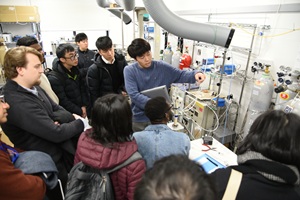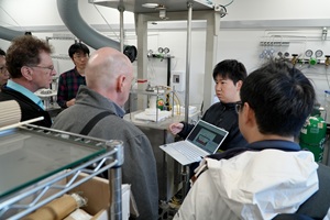 11月6日は、多元物質科学研究所のラボツアーを行いました。ラボツアーでは、メルボルン大学の大学院生と教員が、基盤素材プロセッシング研究分野(植田研究室)、材料分離プロセス研究分野(柴田浩幸研究室)、金属資源循環システム研究分野(柴田悦朗研究室)の居室や実験室を訪問し、研究内容や実験装置についての説明をうけました。