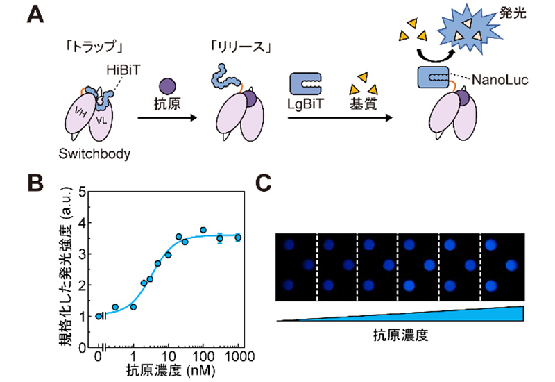 実際にSwitchbodyを大腸菌で発現させたあと精製し、NanoLuc由来のもう一方の酵素断片であるLgBiTと基質であるフリマジンの存在下で発光強度を測定したところ、抗原濃度依存的にシグナルの増大が確認されました(図1B)。この増大は市販のカメラでも明瞭に検出できるほど顕著であり、Switchbodyが簡便に利用できる生物発光免疫センサーとして、応用展開し得ることが示されました(図1C)。
