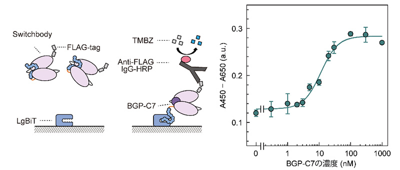Switchbodyとして、発光酵素NanoLuc由来の11アミノ酸断片であるHiBiT[参考文献3]を、抗体KTM219の一本鎖抗体断片scFvのN末端側に融合させたタンパク質を設計し、酵素活性で抗原を検出できるかどうかを検討しました。KTM219は、骨粗鬆症のマーカーであるオステオカルシン(BGP)のC末端の7アミノ酸BGP-C7(アミノ酸配列:RRFYGPV)を抗原として認識する抗体です。この酵素断片融合抗体の分子デザインは、私たちがこれまでに開発してきた蛍光免疫センサーQ-bodyに着想を得ています。Q-bodyは抗体のN末端側に蛍光色素を修飾することで作製されます。この蛍光色素は抗原結合部位近傍でトラップされ消光状態となりますが、抗原の結合に伴ってリリースされることで蛍光を発します[参考文献4]。この原理に倣い、Switchbodyでは抗体に融合した酵素断片がトラップされますが、抗原との結合によりリリースされると、残りの酵素断片と相互作用することで酵素が再構成されて活性を示すことを想定しました(図1A)。