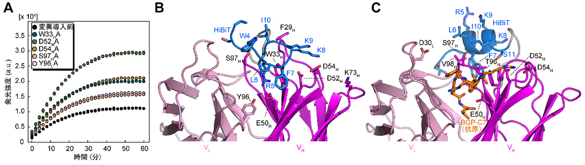 HiBiTの抗体へのトラップについて、具体的にどのような相互作用でトラップが引き起こされているかを調べるためにMDシミュレーションを実施し、抗原非存在下でscFvのアミノ酸残基のうちHiBiTと高頻度で接近する残基を8カ所予測しました。この八つのアミノ酸をそれぞれアラニン(Ala)に置換したSwitchbodyを作製してLgBiTを固相化したELISAで評価することで、変異導入前と比較してシグナルが有意に高い、すなわち変異導入によりHiBiTのscFvへのトラップが弱まっていると考えられる五つの変異体を選択しました。その中でも、抗体の重鎖の52番目のアスパラギン酸(Asp52H)をAlaに置換した変異体は、変異導入前や他の変異体と比較して、抗原非存在下で最も高い発光強度を示したことから(図3A)、Alaへの置換によってHiBiTの9番目のリシン(Lys9)との静電相互作用(図3B)が解消されることでトラップが弱まったと考えられました。一方、抗原存在下でSwitchbodyの発光強度が増大する理由としては、抗原がAsp52Hと相互作用することで、Lys9の静電相互作用の相手が失われて、HiBiTがリリースされるためと推測されました(図3C)。これらの知見は、抗原結合によって活性がオンになるタンパク質スイッチを自在に作製する技術を確立するための重要な手掛かりとなると期待されます。