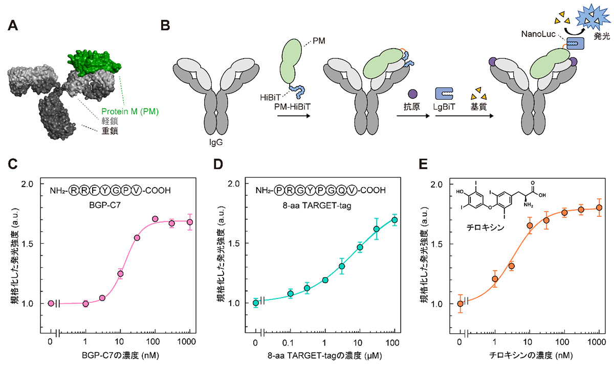 最後に、Switchbodyの作動原理が抗体の種類を変えても成立するかを検証しました。効率よく検証するために、抗体の軽鎖に強く結合するProtein M(PM)(用語8)[参考文献5](図4A)のC末端側にHiBiTを融合したPM-HiBiTを作製して抗体と混合し、HiBiTが抗体にトラップされ、抗原結合によりリリースされるかどうかを確認しました(図4B)。抗BGP抗体KTM219、抗TARGET-tag抗体P20.1、抗チロキシン抗体ME.125の3種類の抗体を用いて検証したところ、いずれの抗体においても抗原濃度依存的に発光強度が増大しました(図4C–E)。興味深いことに、P20.1はKTM219においてHiBiTとの静電相互作用に重要であったAsp52Hを欠いているにもかかわらず、抗原濃度依存的に酵素活性が上昇しました。これは、酵素断片と抗原結合部位近傍のアミノ酸との相互作用が静電相互作用に限定されず、多様な様式で相互作用し、抗原結合に伴ってリリースされ得ることを示しています。つまり、抗体のN末端側に酵素断片を融合するだけで抗原濃度依存的に酵素活性を上昇させる仕組みを構築できる可能性が示されました。一方、未発表ではありますが、NanoLuc以外の酵素を使ってもSwitchbodyを作製できることが判明しており、今後、さまざまな酵素と抗体との組み合わせで多様なSwitchbodyを作製していく予定です。