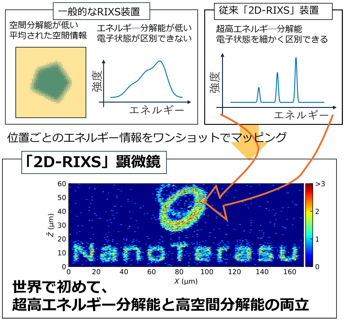 図1:  超高エネルギー分解能と高空間分解能を両立する「2D-RIXS顕微鏡」の概念図。 2024年にQSTが開発したナノテラスの「2D-RIXS」装置では、一般的なRIXS装置(上段左)と比較して、電子状態の違いを格段に精細に識別できる超高エネルギー分解能を達成した(上段右)。さらに本研究では、高い空間分解能を持った計測も同時に実現し、試料内部の量子状態の分布を顕微鏡のように直接観察することに成功した(下段)。下段のイメージは2D-RIXS顕微鏡によるニッケル薄膜微細構造の空間分解測定結果。多彩な磁性体のスピン状態を担うニッケル3d電子に対応するRIXS信号を用いることで、スピン状態を応用したデバイスを模擬してシリコン基板上に形成した微細パターンの電子状態分布をマッピングした(色はニッケル3d電子の情報に対応している)。本結果は、850エレクトロンボルト付近の軟X線を用いて、空間分解能1マイクロメートル、エネルギー分解能約17ミリエレクトロンボルトでのRIXSイメージングが可能であることを示している。