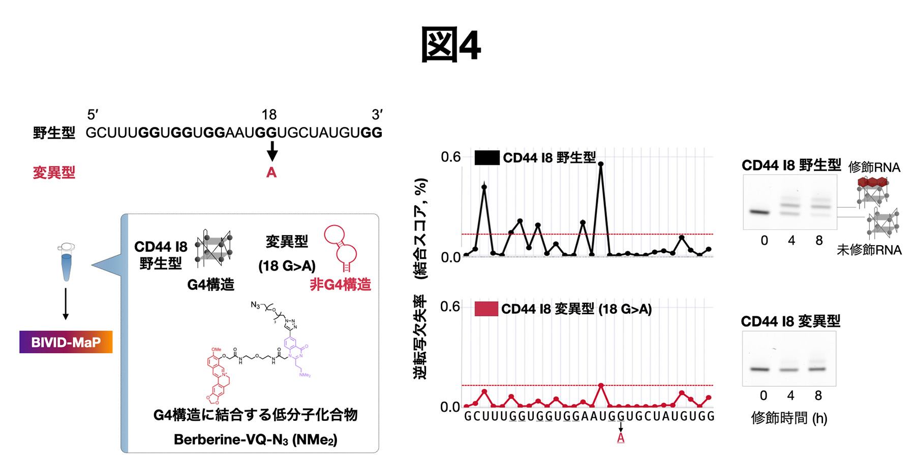 G4構造に結合する「Berberine」にVQを結合させた「Berberine-VQ」を作成しました。標的となるRNAにBerberine-VQを反応させて、逆転写して得られたDNAを次世代シーケンサーで解析し、どの塩基にBerberineが結合していたかを特定すると、G4構造に結合していました。つまり、BIVID-MaPはRNAと低分子化合物が相互作用する部位を特定できることを表しています。
