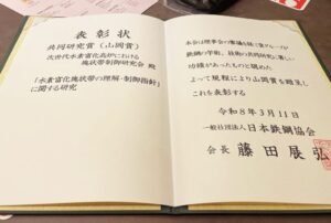 2026年3月11日、埜上教授, 夏井准教授(副主査)が参加した「次世代水素富化高炉における塊状帯制御研究会研究会」が日本鉄鋼協会「山岡賞」 (共同研究賞) を受賞しました。 受賞題目は「水素富化塊状帯の理解・制御指針に関する研究」です。