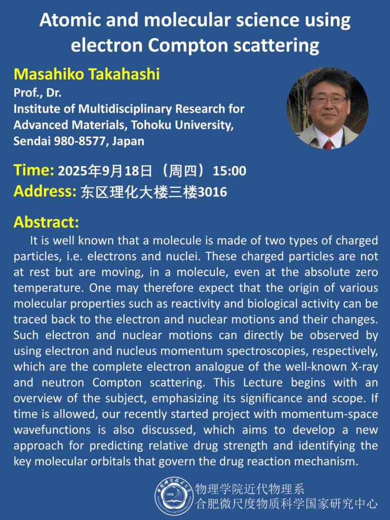 【国際会議・招待講演(口頭)】髙橋正彦教授が、2025年9月18日に中国・合肥市の中国科学技術大学・合肥微尺度物質科学国家研究中心において、 「Atomic and molecular science using electron Compton scattering」と題した講演を行いました。