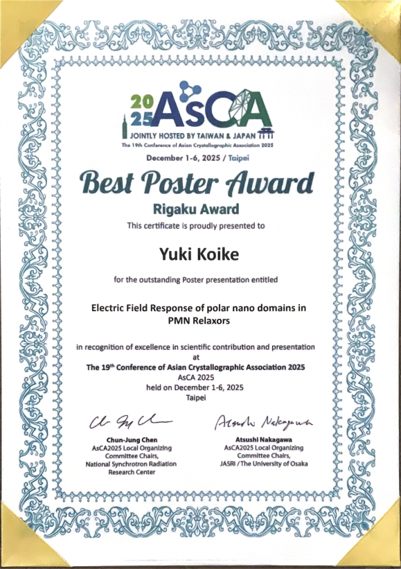 AsCA2025(アジア結晶学会)にてM2古池佑紀くんがBest Poster Awardを受賞しました