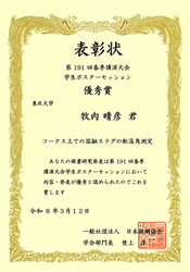 柴田浩幸研究室の上村源助教が「奨励賞」を受賞しました。