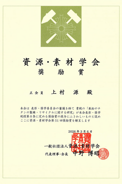第51回 資源・素材学会「論文賞」、「奨励賞」を受賞
