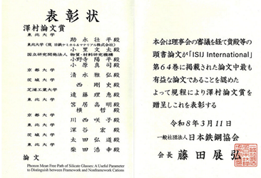 日本鉄鋼協会「澤村論文賞」を受賞しました。